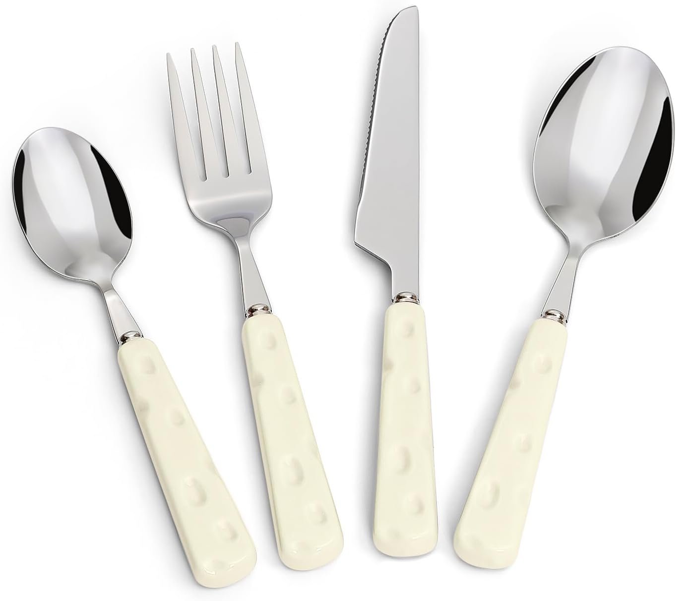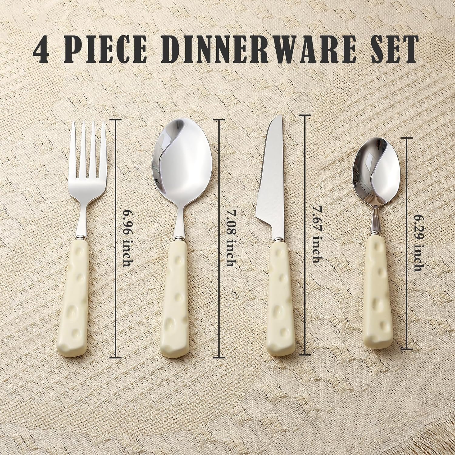 4-Piece Cutlery Set, Stainless Steel Flatware Sets with Chubby Lovely Cheese Pattern Ceramic Handle, Utensils including Knife Fork Spoon (Beigh)